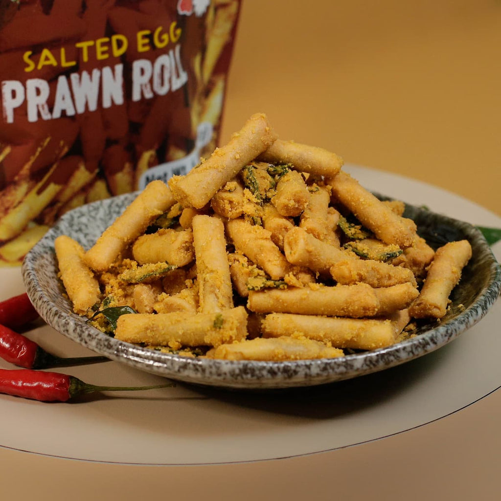 Prawn rolls are the must-have snacks for festivities and we’ve added a salted egg twist to this irresistible hae bee hiam (spicy shrimp) filled roll goodness. Hae Bee Hiam (spicy shrimp) is a perfect combination of shrimp and spices. With the added salted egg coating to the rolls, it takes just one bite. You’ll be experiencing a crunchy burst of salted egg and spicy shrimp flavours with each individual roll!